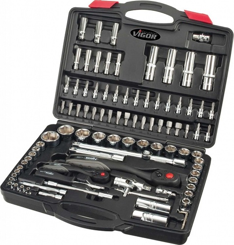 В комплекте: ▪ Головки 1/4": 4-4,5-5-5,5-6-7-8-9-10-11-12-13-14 мм ▪ Головки длинные 1/4": 6-7-8-9-10-11-12-13 мм ▪ реверсивная трещотка 1/4", Т-образный вороток 1/4", ▪ универсальн. шарнир, держатель, удлинители 50 и 100 мм ▪ Головки 1/2": 10-11-12-13-14-15-16-17-18-19-20-21-22-24-27- 30-32 мм, ▪ свечные головки 16 и 21 мм ▪ Головки длинные 1/2": 14-15-17-19-22 мм ▪ реверсивная трещотка 1/2", универсальн. шарнир, ▪ адаптер 3/8", удлинители 125 и 250 мм ▪ головки 1/4" шестигранники 3-4-5-6 мм ▪ головки 1/4" Phillips PH1-2, под шлиц 4-5.5-6,5 мм, PZ1-2, ▪ головки 1/4":TORX Т8-T10-T15-T20-T25-Т27-T30 ▪ Г-обр. ключи 1.5-2-3 мм, набор бит 17 шт. VIGOR, Германия.