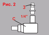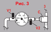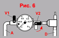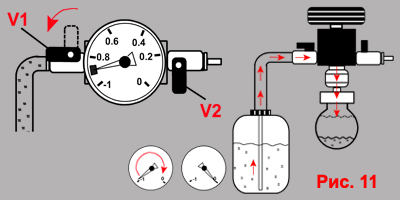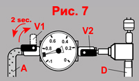 Предварительные мероприятия/требования: – Расширительный бачок системы охлаждения должен быть пустым. – Проверьте емкость системы охлаждения (обратитесь к руководству по эксплуатации автомобиля). – Подача сжатого воздуха должна составлять 6-10 бар (87-145 psi). – В систему следует заполнить на 1-2 литра больше емкости системы охлаждения. Частицы ржавчины и грязи ни в коем случае не должны попадать в прибор KVB .. или в охлаждающую жидкость. – Во время работы рекомендуется использовать контейнер со шкалой, указывающей уровень охлаждающей жидкости. – Наилучший результат достигается при размещении контейнера со шкалой на уровне расширительного бачка системы охлаждения. – Установите регулятор системы отопления (в салоне автомобиля) в положение максимального обогрева. Как это работает: – Внутренняя резьба трубки Вентури (C) составляет 1/4". Подсоединяйте соответствующий ниппель (3). (см. рис. 2) – Снимите крышку радиатора. Насадите прессовый переходник K.. или накрутите универсальный переходник с резьбовой оправой UA 50 на заливную горловину расширительного бачка. – Снимите крышку радиатора. Насадите прессовый переходник K.. или накрутите универсальный переходник с резьбовой оправой UA 50 на заливную горловину расширительного бачка – Подсоедините прибор KVB 01 в точке (E). (см. рис. 1) – Следите, чтобы запорные краны V1 и V2 были закрытыми. (см. рис. 3) – Подсоедините трубку Вентури (C) к прибору KVB 01. (см. рис. 4) – Подсоедините сопло (3) к установке подачи сжатого воздуха. Примечание: Сопло Вентури издает шипящий звук. Это нормальное явление. (См. рис. 5) – Стравите заливной трубопровод (A). – Опустите заливной трубопровод (A) в охлаждающую жидкость и закрепите его во избежание соскальзывания. – Откройте запорные краны V1 и V2. – Заливной трубопровод (A) заполняется охлаждающей жидкостью. – Не закрывайте запорный кран V1, пока в заливном трубопроводе (А) не исчезнут все воздушные пробки. – Излишки охлаждающей жидкости дренируют по трубопроводу (D). – Заранее приготовьте емкость для сбора охлаждающей жидкости. (см. рис. 6 и 7) Создание вакуума в контуре охлаждения – Конечный вакуум достигается на уровне между -0.85 и -0.9 бар (12,3 и 13 psi) (зеленая зона на дисплее вакуумного измерителя vacuum). (См. рис. 8) – Закройте запорный кран V2. Отсоедините установку подачи сжатого воздуха от сопла (3) на трубке Вентури (C). (См. рис. 9) Проверка герметичности системы – Система охлаждения будет находиться в состоянии вакуума в течение 1 минуты. Снижение вакуума указывает на протекания системы охлаждения (обратитесь к дисплею вакуумного измерителя). – Если вакуум остается неизменным, наполнение системы охлаждения можно продолжать. (См. рис. 9) Наполнение системы охлаждения – Осторожно: Количество охлаждающей жидкости для заполнения системы должно превышать емкость системы на 1-2 литра. Избегайте наполнения системы до последней капли. Очень часто остатки охлаждающей жидкости содержат частицы ржавчины и грязи. Во избежание этого Откройте запорный кран V1. (рис. 11). Проверьте объем заполненной охлаждающей жидкости или заполните расширительный бачок до отметки max. Остаточный вакуум в системе после ее наполнения можно убрать открыванием запорного крана V2. – Вакуум в системе охлаждения является причиной деформации гибких трубопроводов. Это может привести к снижению уровня охлаждающей жидкости в 