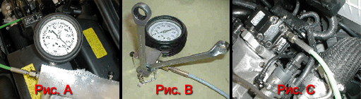 – Подсоедините прибор к насосу высокого давления с помощью гибкого трубопровода высокого давления (1) Рис. C. – Перед началом проверки из прибора следует полностью удалить весь воздух с помощью воздухоотводного винта (2) Рис. A. Для этого на короткое время включите зажигание или стартер. Точность измерений может быть достигнута только после надлежащего заполнения системы (без воздушных пробок). – Для проведения проверки запустите двигатель на холостых оборотах. – Считайте показания манометра. – Перед отсоединением прибора спустите остаточное давление с помощью воздухоотводного винта (2). – Отсоедините трубопроводы высокого давления от насоса и топливопровода. – Установите системы автомобиля в исходное состояние.