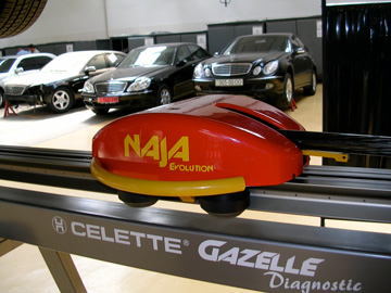 В 2006 году в дополнение к классическим мобильным стапелям SEVENNE добавилась современная топ-модель от CELETTE - рихтовочный стенд GRIFFONE со встроенным вторым лифтом. Спезиальная система для рихтовки рамных автомобилей. Стенды CELETTE, также как и приспособления к ним, сделаны мощно и надежно Традиционно на Мерседесе рихтовку производили с использованием системы жестких калибров - MZ.Однако, начиная с 2002 года, автопроизводителем MERCEDES-BENZ было разрешено использовать в качестве системы измерений компьютерную систему NAJA, CELETTE. Компьютерная система нового поколения NAJA EVOLUTION - уже на Мерседесе. NAJA используется при экспертизе автомобилей для проверки геометрии кузова. Автомобиль при этом вывешивается на двухстоечном подъемнике, а измерительная головка устанавливается на специальном мобильном устройстве GAZELLE. Для проведения промеров во время выполнения рихтовки кузова, NAJA устанавливается на рихтовочный стапель. NAJA просто незаменима в сложных случаях рихтовки при замене элементов кузова. Обучение и тренинг по работе с компьютерной системой NAJA на станции Мерседес проводил экспорт-менеджер фирмы CELETTE - ARMAND SHIBI. «NAJA - отличная система, но это только инструмент, - главное что у тебя в голове и за душой, мой дорогой - думай, чувствуй, понимай» - цитата от Армана Шиби.