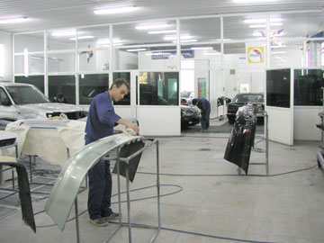 «Автомобильный дом Одесса»Это один из самых знаменательных проектов Автомеханики. В конце 90-х годов, когда разрабатывался и реализовывался данный масштабный проект, в Украине еще не было таких больших современных покрасочно-рихтовочных комплексов, - даже у ведущих импортеров в Киеве. В то время идеология создания участков покраски сводилась только к покупке покрасочно-сушильной камеры, а подготовка под покраску даже на фирменном сервисе мало чем отличалась от «гаражно-кооперативной» - шлифовка «по-мокрому». Современные кузовные центры были где-то там, не у нас, потому многие решения и проекты создавались только на основе воображения создателей. Этот центр в Одессе - первый по своим масштабам не только для своего региона, но и самый крупный на то время во всей Украине. Идеолог и СОЗДАТЕЛЬ кузовного центра нового поколения - Костенко Виктор Васильевич Стратегическое мышление, чувство времени, масштабность и смелость - качества, которые не так часто встречаются в повседневном «рабочем» контакте. Работать с таким партнером было крайне интересно и результат поразил даже нас. Кузовной центр получился очень просторным, а для масштабов Одесского региона он просто очень большой - НО ЭТО ТОЛЬКО ВНАЧАЛЕ! При проектировании центра мы пытались честно «сэкономить» деньги для партнера, который нам доверился и рекомендовали «разворачиваться» немного скромнее, справедливо опираясь на свой достаточно уже неплохой наработанный опыт на центральных станциях Украины. Однако, как позже показало время, мы были не правы - именно крупный современный кузовной сервис дал возможность центру работать на полную мощность и получить быстрый возврат крупных инвестиций.  |  | Покрасочно-сушильная камера экстра-класса от BLOWTHERM. Постов подготовки под покраску заложено с хорошим запасом - это позволило загрузить камеру по-полной - на 3 смены. | Посты сухой подготовки с системой пылеудаления BP-TRIPLEX. |  |  |