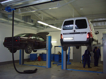 Как и положено современной СТО - нормально организованный воздухообмен и вытяжные системы удаления выхлопных газов - как барабанного так и рельсового типа.